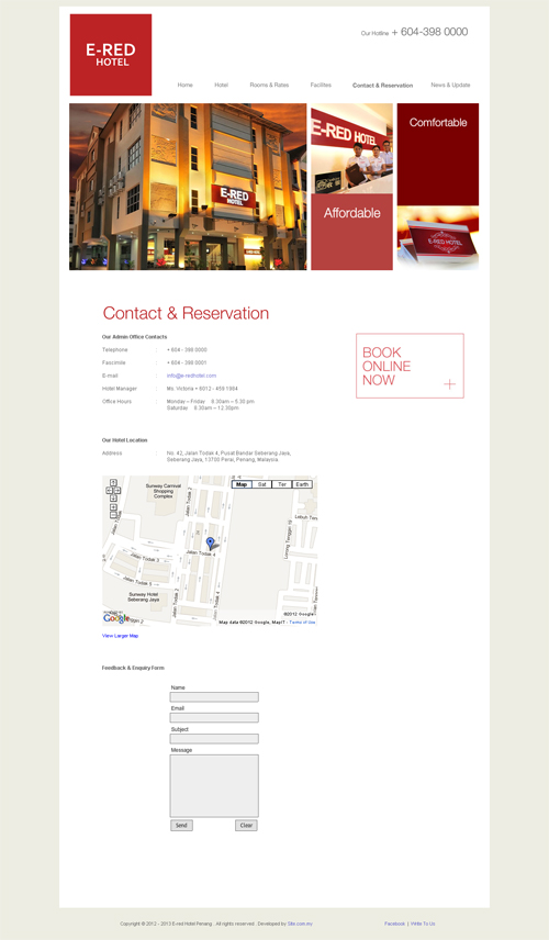 Here is the design of the web site for E-Red Hotel, a hotel which is located in a leading and prominent business and leisure district in Bandar Sunway, Seberang Perai.